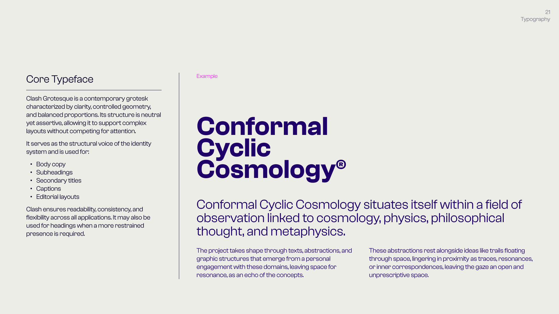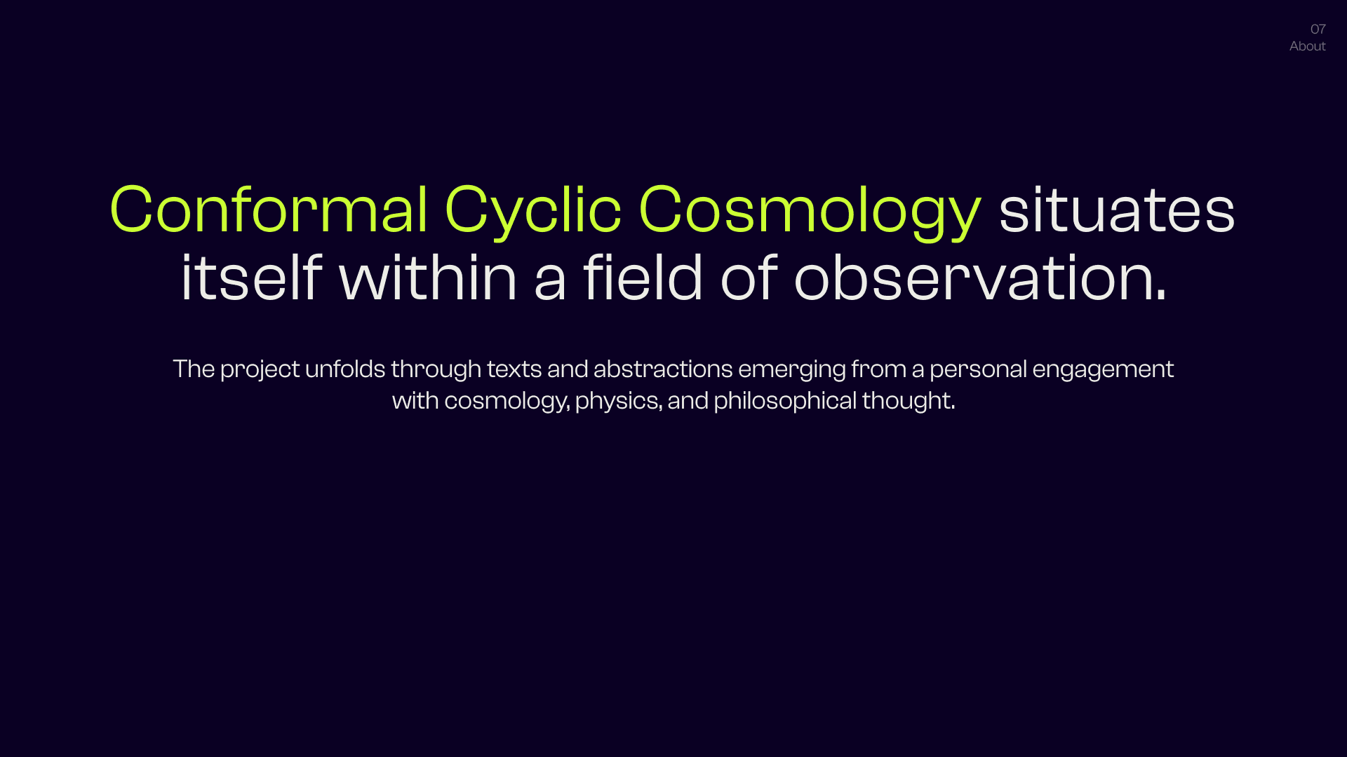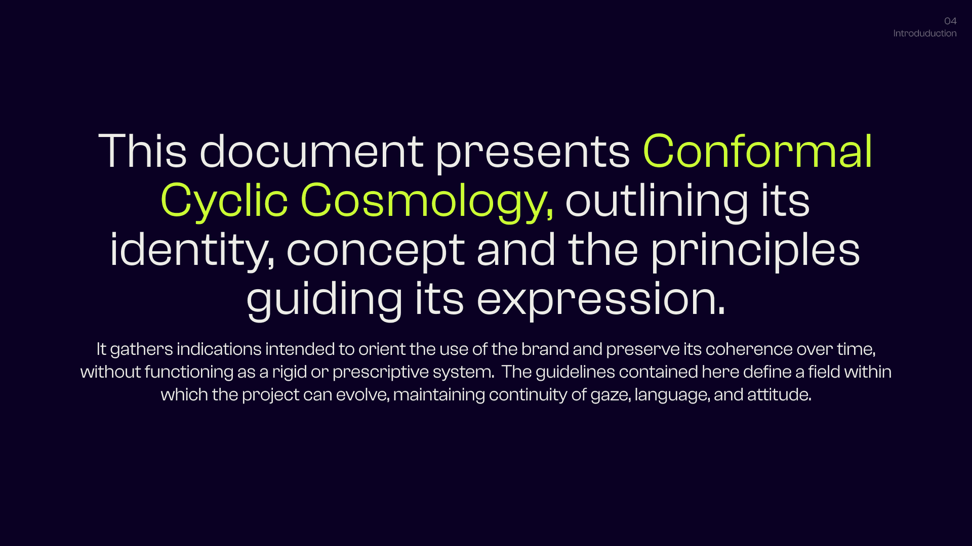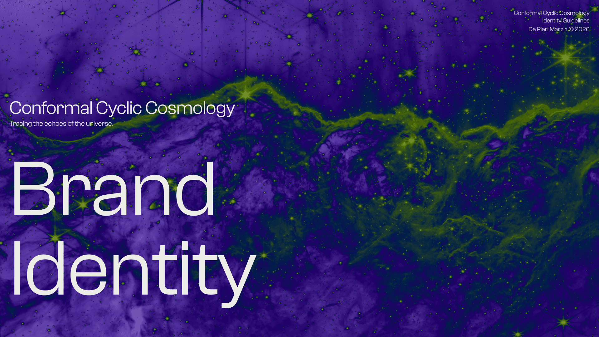 This is the Visual Identity of Conformal Cyclic Cosmology (C.C.C.), a personal project that builds a bridge between cosmology, physics, philosophical thought, and visual research — understood as interconnected fields of conceptual, visual, and perceptual exploration. C.C.C. takes these areas as raw material: it moves through them, reworks them, and produces outputs through a constantly evolving language made of forms, text, visual abstractions, graphic structures, animations, and visual systems. It is not concerned with illustrating or explaining scientific concepts directly, but with treating them as generative frameworks — abstract, malleable ideas that become material for visual and conceptual construction, where thinking happens through form rather than explanation. In this space, language is never fixed, but shifts through variation, recurrence, and subtle changes in meaning.