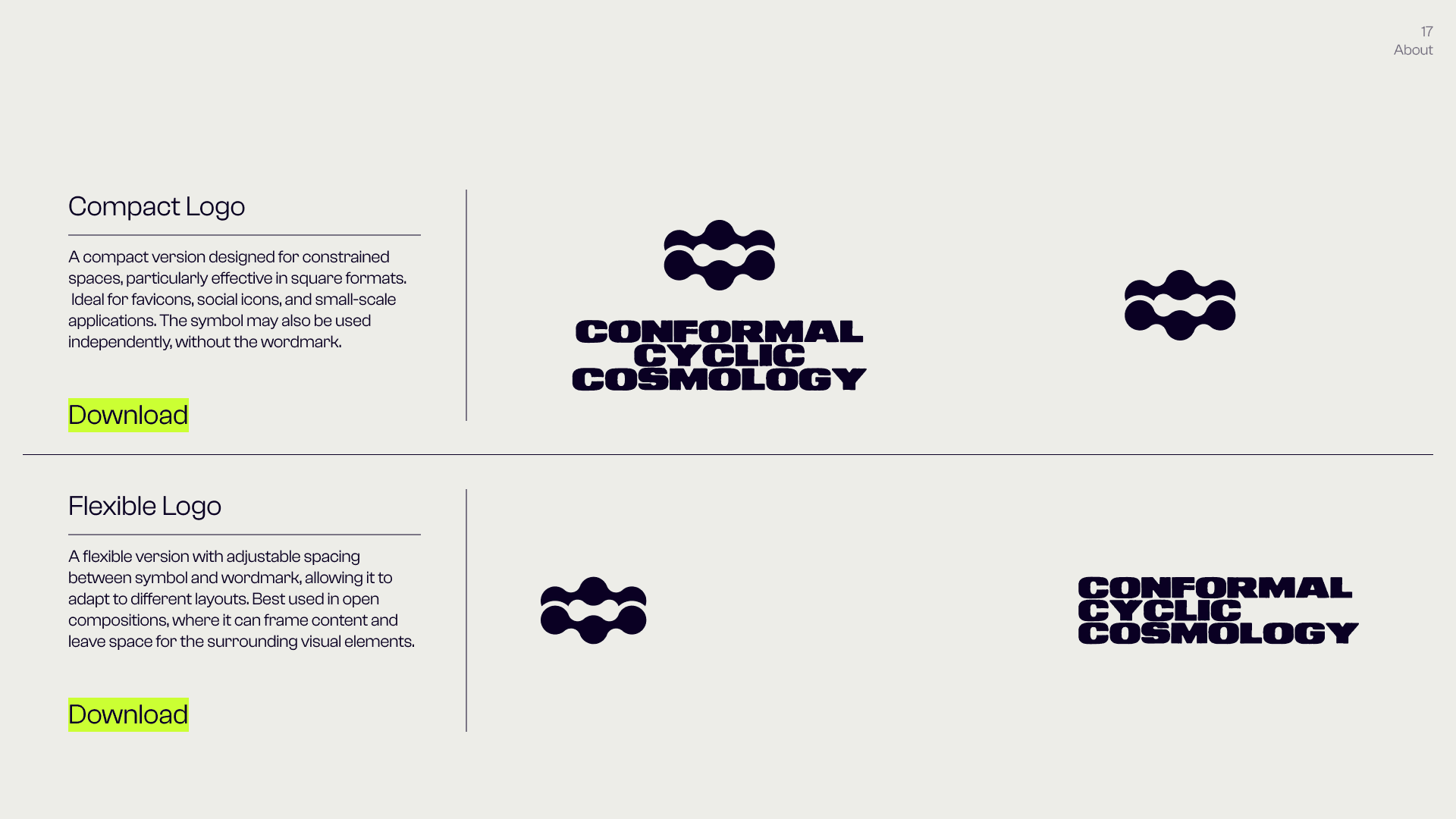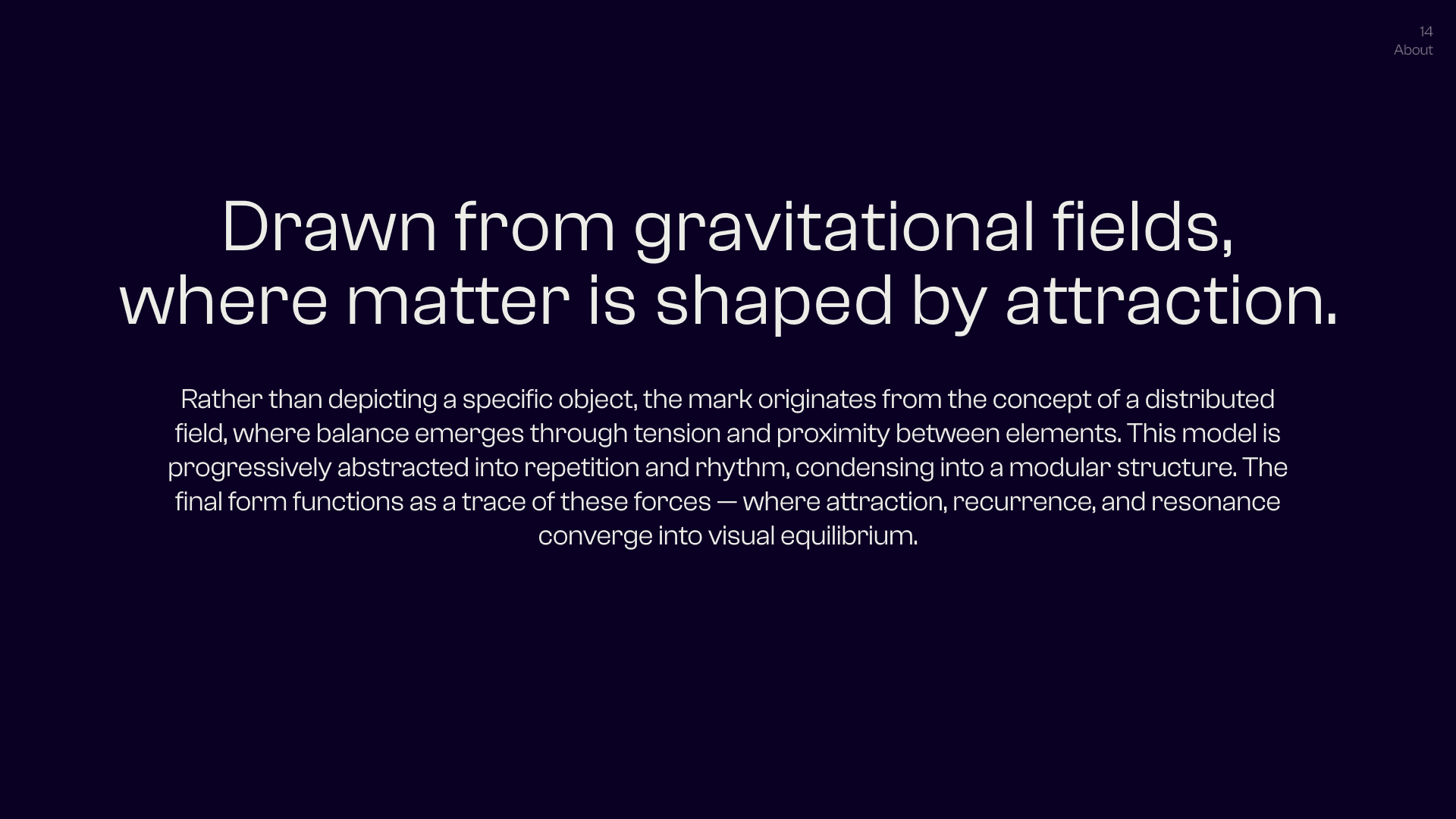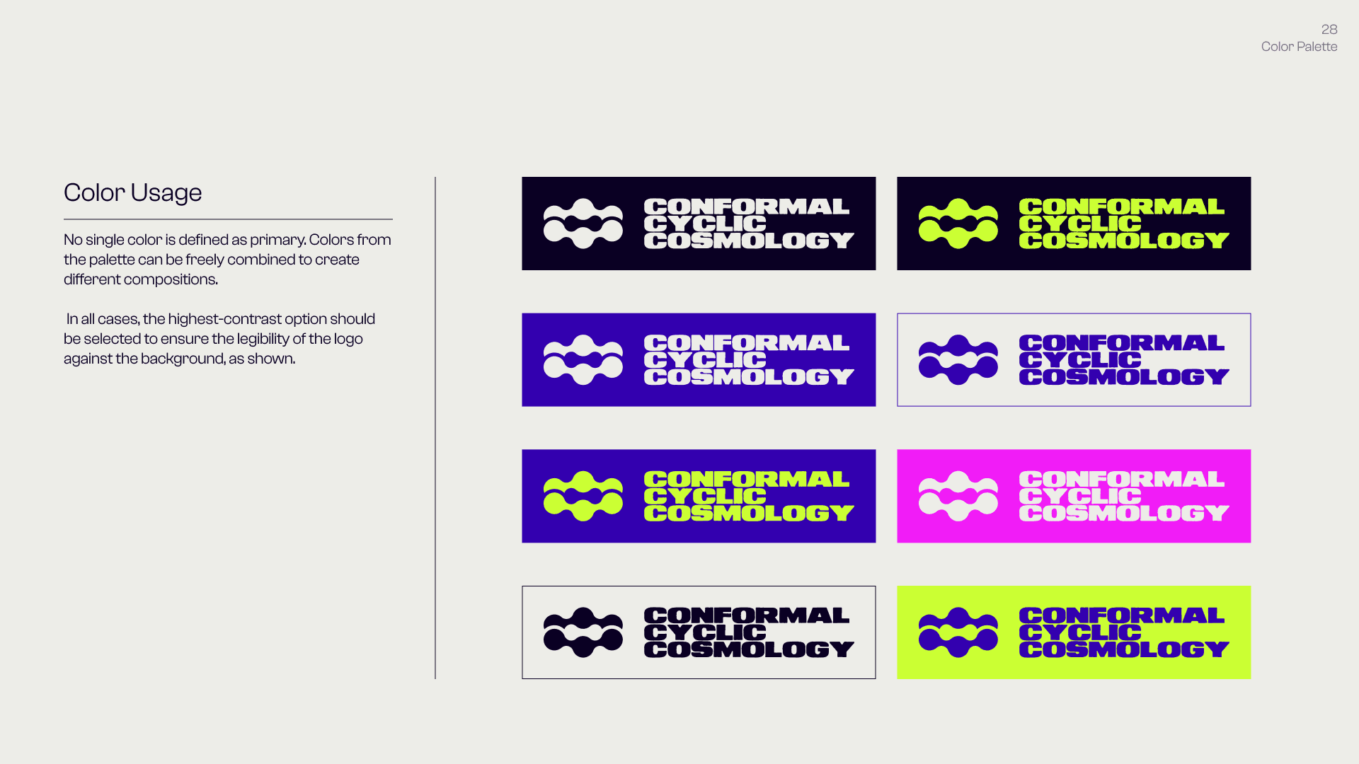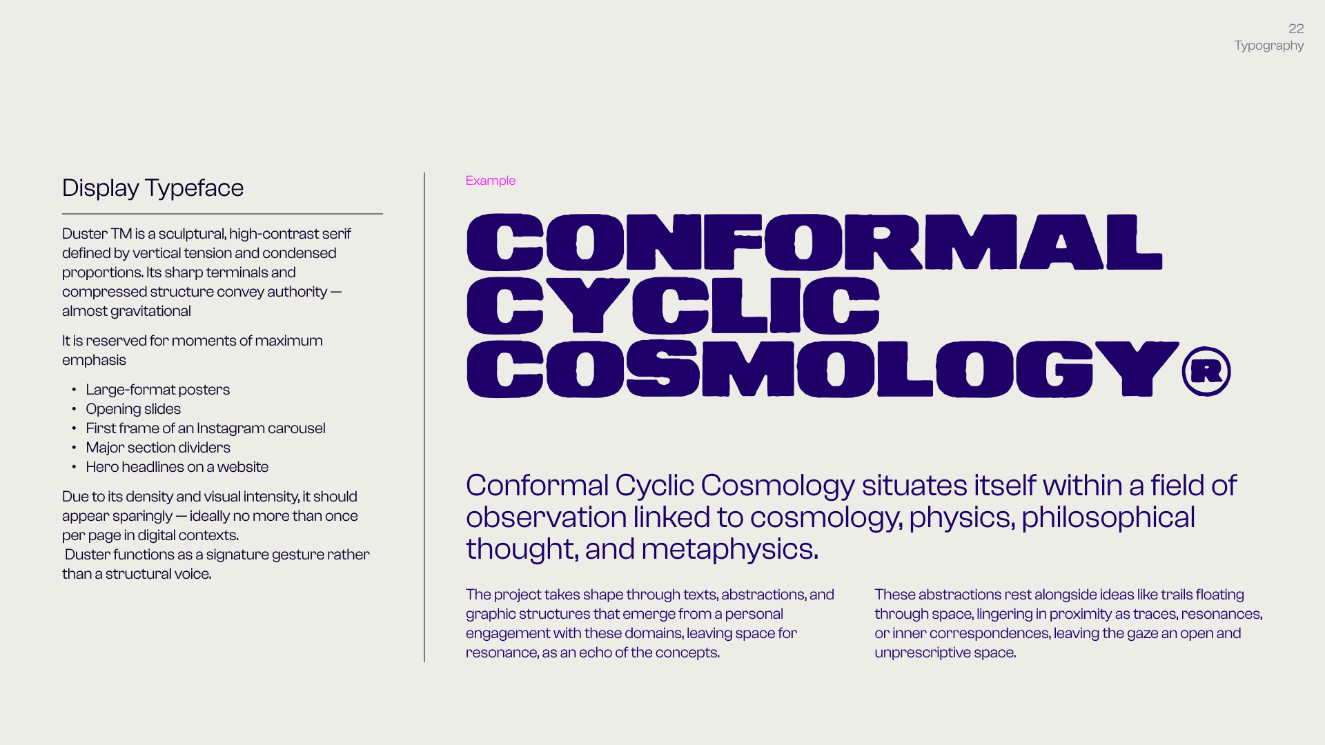 This is the Visual Identity of Conformal Cyclic Cosmology (C.C.C.), a personal project that builds a bridge between cosmology, physics, philosophical thought, and visual research — understood as interconnected fields of conceptual, visual, and perceptual exploration. C.C.C. takes these areas as raw material: it moves through them, reworks them, and produces outputs through a constantly evolving language made of forms, text, visual abstractions, graphic structures, animations, and visual systems. It is not concerned with illustrating or explaining scientific concepts directly, but with treating them as generative frameworks — abstract, malleable ideas that become material for visual and conceptual construction, where thinking happens through form rather than explanation. In this space, language is never fixed, but shifts through variation, recurrence, and subtle changes in meaning.